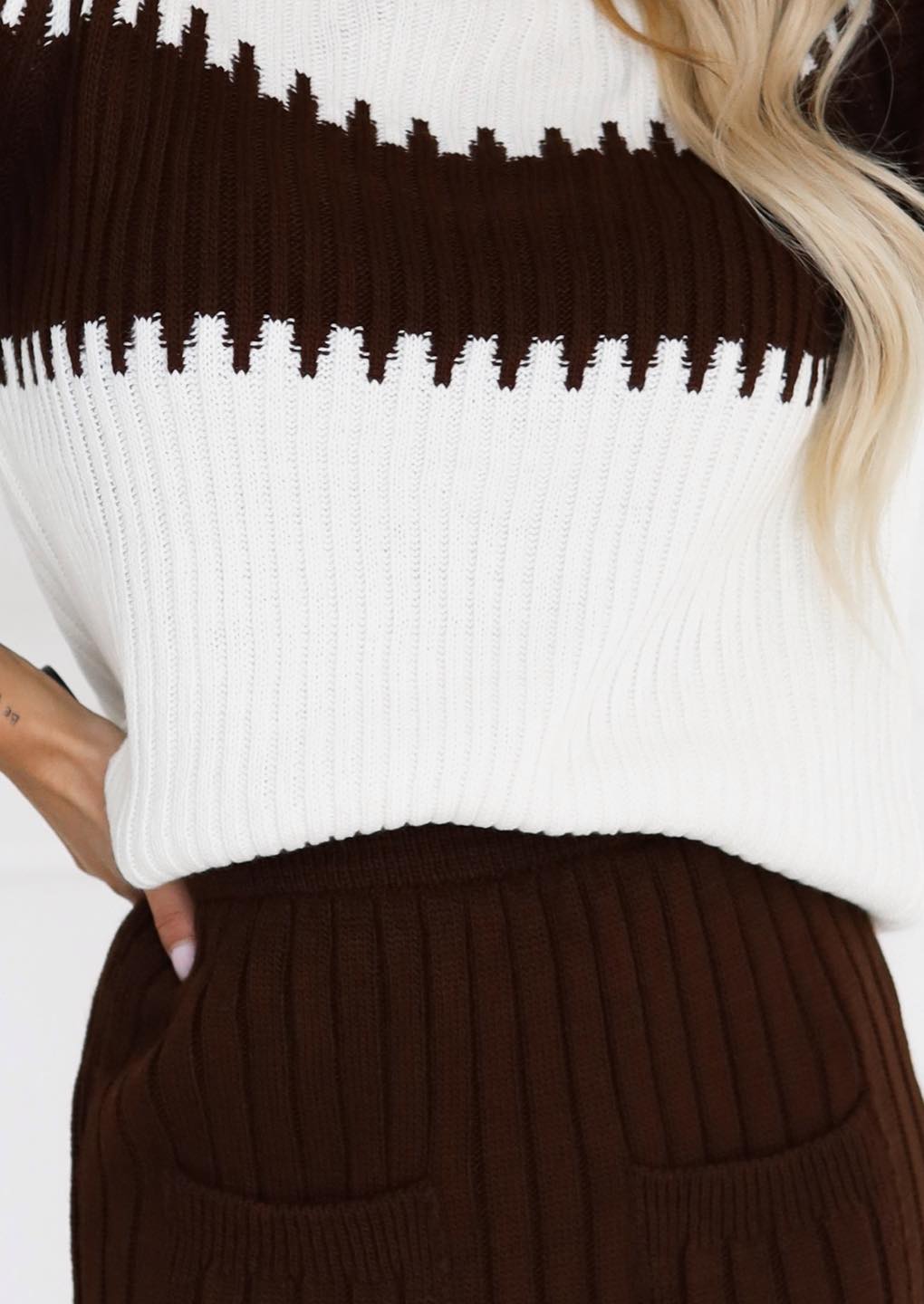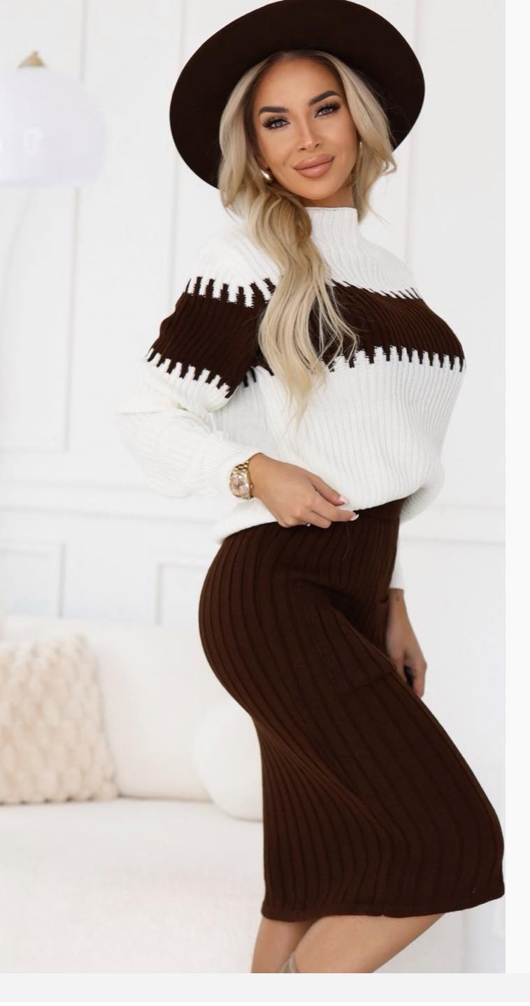 Kontrastný sveter v jemných prírodných tónoch krásne dopĺňa rebrovaná sukňa, ktorá zvýrazní siluetu a zároveň poskytuje maximálne pohodlie. Set je ideálny na bežné nosenie, stretnutia, ale aj na elegantnejšie príležitosti.